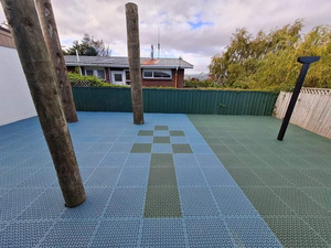 New softfall surface installed at an early childhood centre using Play Matta™original tiles and shock pad, mid green and light blue, supplied and installed by Otago Engineering. The existing matting which had deteriorated has been lifted and replaced with brand new safety softfall surface.
